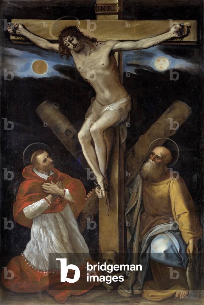 MPH5034010 Crucifixion with Saint Charles Borromee (Carlo Borromeo) and Saint Andre Inscription “” INRI”” on the cross. Painting by Jacopo Borbone. beginning of the 17th century Church of San Quirino, Correggio, Italy