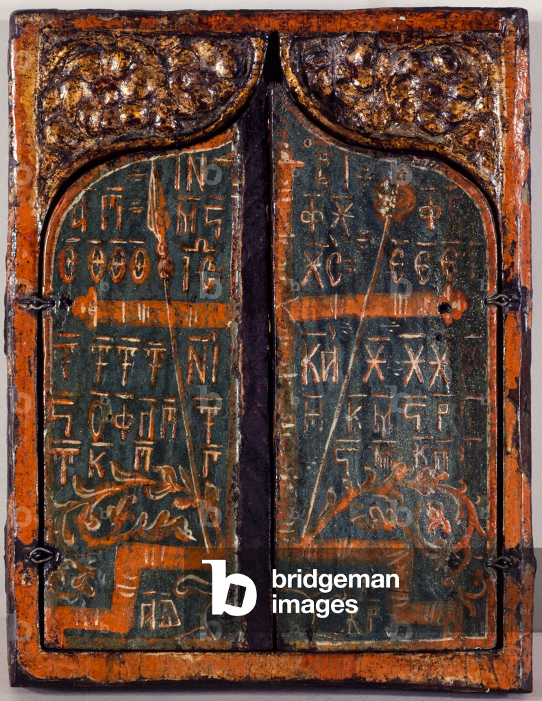 XOS8986077 Triptych of the Dormition of the Virgin (Main title)Greece, School of (Greek School)The central panel depicts the episode of the Dormition of the Virgin. The Virgin, lying on her deathbed, is surrounded by the apostles Peter, on the left with a censer, and Paul on the right, two hierarchs, men and women, two angels and a cherub above Christ, in the center, who holds the personification of his mother's soul on his left arm. Also depicted is the Jew Athonios, whose desecrating hands cut off by the angel still hang from the parade bed. The scene is set against an architectural backdrop. Both panels are decorated with images of saints. In the upper register, blessing, Saint Nicholas on the left and Saint Charalampe on the right. In the lower register, mounted on their steeds, Saint George and Saint Demeter.Legend - Inscriptions in Greek, inside: - Left flap, top: "O HAGHIOS NICOLAOS" (Saint Nicolas); - Left flap, bottom: "O HAGHIOS GEORGHIOS" (Saint Georges); - Right flap, top: "O HAGHIOS CHARALAMOS" (Saint Charalampe); - Right flap, bottom: "O HAGHIOS DEMETRIOS" (Saint Démètre).Inscription - Inscriptions in Greek on the outside, on the closed shutters, from top to bottom and from left to right: "INBI" (corresponds to the Latin INRI. B="basileus" for R="rex"); "A P M ST F ? F?" (the light of Christ shows itself to all); "TH TH TH E E E E"(Elenê Euré Eléous Ereisma - [Saint] Helena discovered the tree of pity); "TTTT ????"(Christos Charin Christianois Charizei - Christ dispenses his grace to Christians); ST TH PH L P T HE K M ST R ; T K P G ST M K L (topos craniou paradeisos gegoné - the location of the skull became paradise); A D K R (Adamou cranion - Adam's skull)Stock number: PPP4893