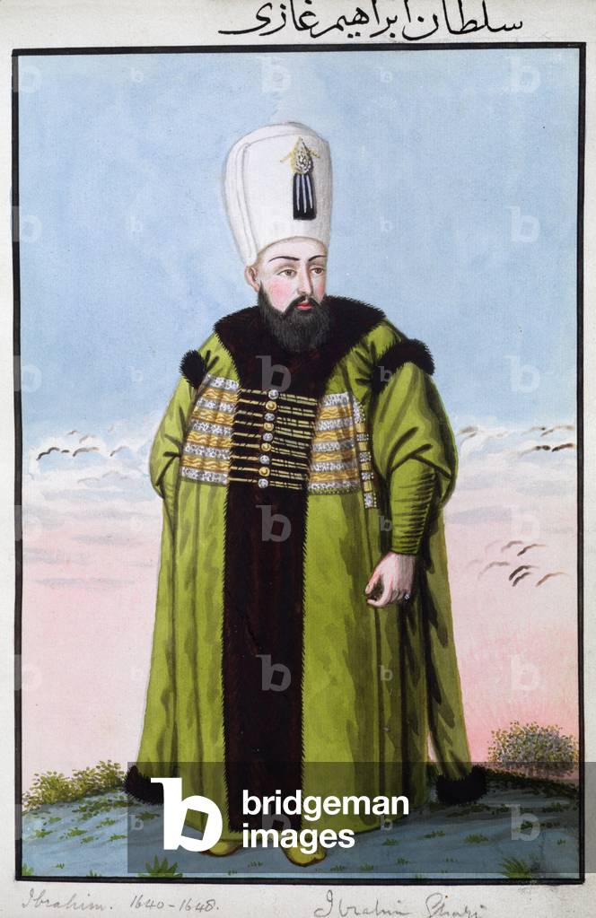 HIM5263576 Portrait of Ibrahim I (1615-1648), Ottoman Emperor. Ibrahim (ibrahim Ier le Fou) succeeded his brother Murat IV as Sultan in 1640. Aquarelle de John Young (1755-1825) in 'A series of Portraits of the Emperors of Turkey', 1808.