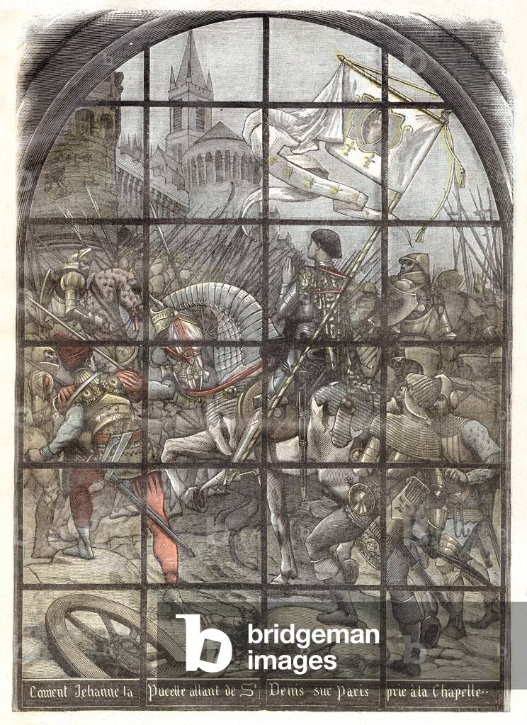 GEG1783235 Joan of Arc on september 6, 1429 praying at St Denis Chapel on road to Paris, illustration from French paper "Le Pelerin" march 7, 1897 representing a stained glass window in St Denis La Chapelle
