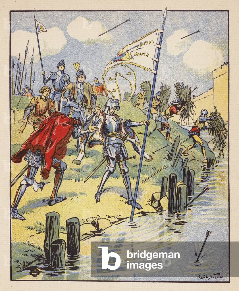 JLJ4624950 Illustration taken from the book “” Jeanne d'Arc “” by Theodore Cahu and illustrated by Paul De Semant (1855-1915): May 7, 1429 Jeanne, who led the French to the assault of the sunflower bastille, was wounded by an arrow
