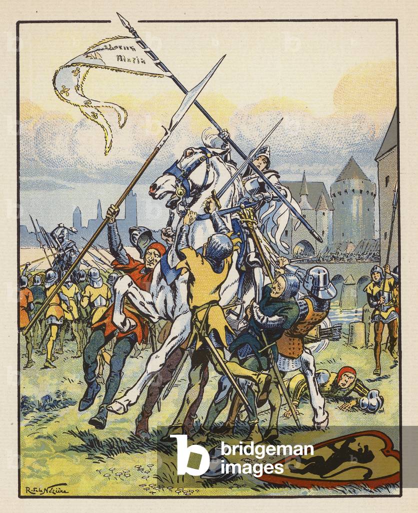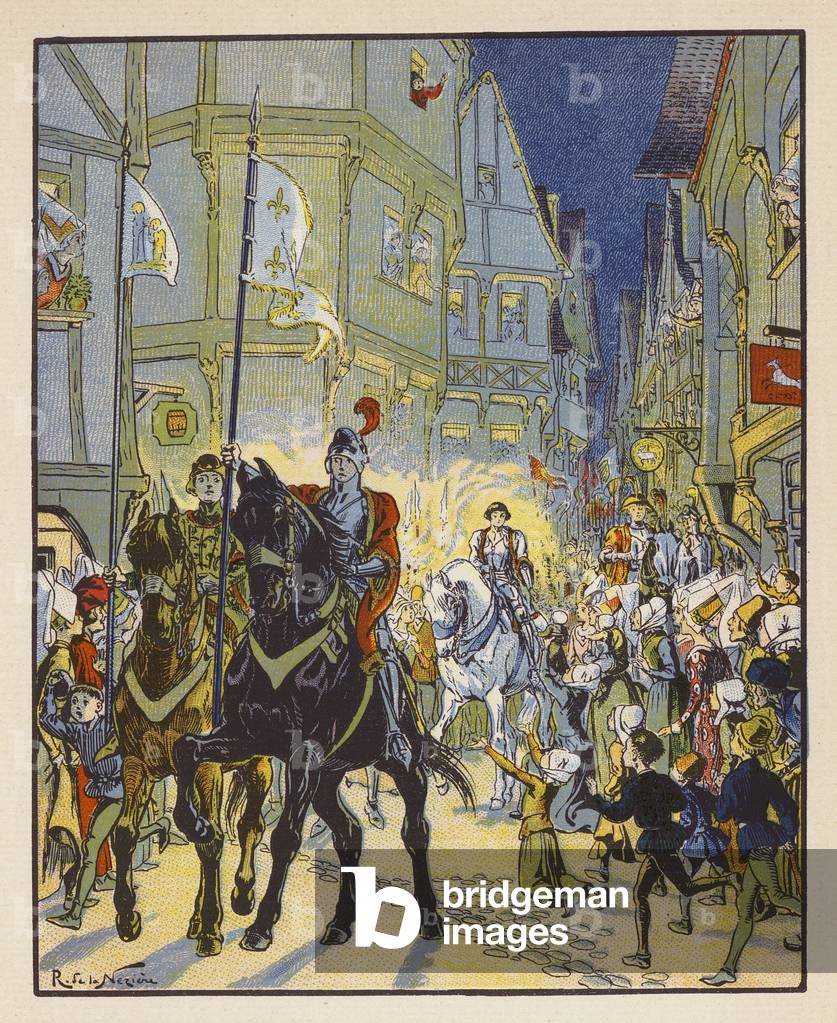 CCI5674919 Histoire. France. Jeanne d�Arc entre dans Orleans, le 29/04/1429. Aquarelle de Georges Scott in: Les moments decisifs de l�Histoire de France, par Jacques Bainville, France, vers 1930. Coll. Part. History. France. Joan of Arc enters in Orleans, Apr., 29, 1429. Illustration by Georges Scott in: Les moments decisifs de l�Histoire de France (France History Schoolbook), by Jacques Bainville, France, vers 1930.
