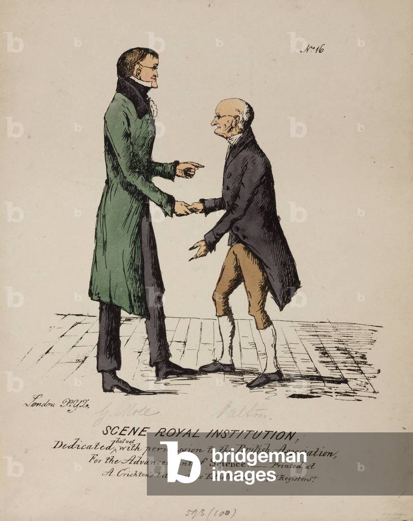 UIS5070865 Scene Royal Institution: Gerrit Moll and John Dalton, c 1831-1840. Coloured lithograph caricature of Gerrit Moll (left), and John Dalton (right). Gerard (or Gerrit) Moll (1785-1838), was a Dutch physicist and professor at the University of Utrecht. Dalton (1766-1844) formulated the atomic theory to explain chemical reactions, based on the concept that atoms of different elements are distinguished by differences in their weights, a theory which has influenced scientific thought for over 150 years. Here Moll is being thanked by Dalton for an anonymous pamplet in defence of English science published in 1831, soon after which Dalton was awarded a pension, announced at the annual meeting of the British Association for the Advancement of Science the artist suggests these events are related. ©SSPL/Science Museum