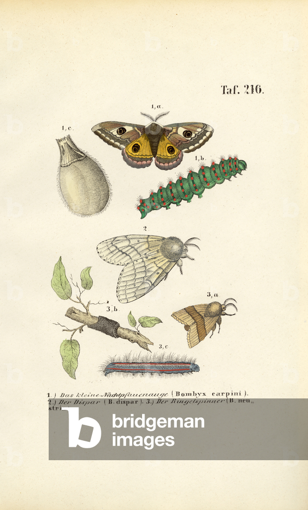 From Naturgeschichte des Tierreichs (Natural History of the Animal Kingdom), published by Emil Hänselmann, c.1914Kupferglucke, Ringelspinner, Gabelschwanz, Buchenspinner, Weidenbohrer, Roßkastanienspinner, Grasvogel oder Grasglucke, Rosenspinner, Fichtenspinner, Weidenspinner, Schmetterlinge, Insekten, Illustration, Naturgeschichte, Tiere, Insekten, SchmetterlingeGastropacha quercifolia, Gastropacha neustria, Malacosoma neustria, Harpia vinula, Cerura vinula, Harpia fagi, Stauropus fagi, Cossus ligniperda, Cossus cossus, Cossus aesculi, Zeuzera pyrina, Gastropacha potatoria, Euthrix potatoria, Liparis dispar, Lymantria dispar, Liparis monacha, Liparis salicis