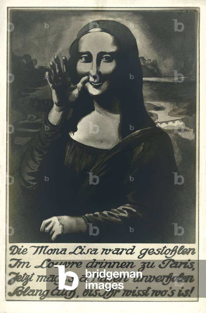 LLM3108096 Who could blame La Joconde for making a little tour of the world? Leonardo da Vinci's painting La Gioconda, or the Mona Lisa, was stolen from the Louvre in Paris in 1911. The wherabouts of the painting remained a mystery until the thief, Vincenzo Peruggia, was caught trying to sell it to the Uffizi Gallery in Florence two years later. Postcard, early 20th century.