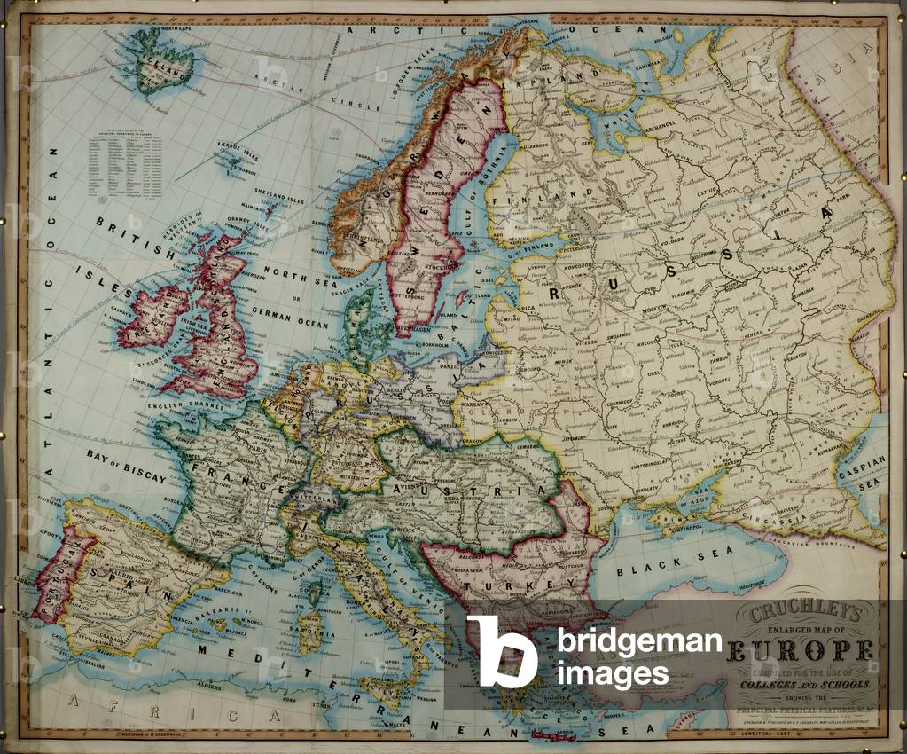 BL3304041 Cruchley's enlarged Map of Europe. Compiled for the use of Colleges and Schools, showing the principal physical features, etc.Author: Cruchley, George Frederick / [London]: engraved and published by G.F. Cruchley, map seller, 81 Fleet Street, 1851. Source/Shelfmark: Maps Roll 167 or Maps S.T.E.1671 map on 9 Sheets joined: hand col.; 171 x 208 cm.