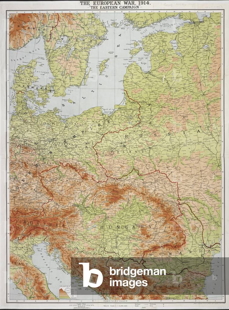 BL3292752 The European War, 1914. "The Eastern Campaign." Natural scale, 1: 2,280,000. (W. & A.K. Johnston's War Map. Petrograd to Berlin, orographically coloured).Edinburgh: W. & A.K. Johnston, [1915]Source/Shelfmark: Maps.1035.(121)