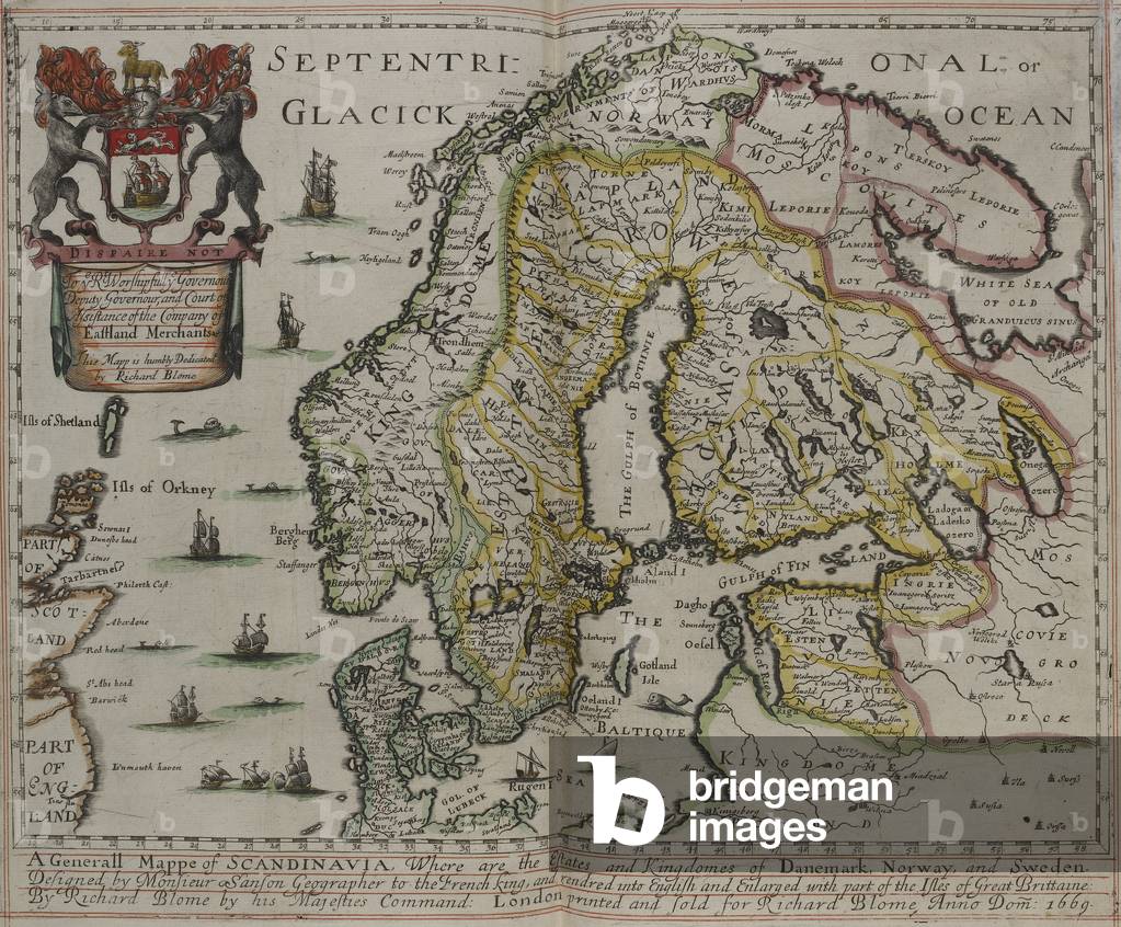 BL3288895 A generall mappe of Scandinavia, where are the Estates and Kingdomes of Danemark, Norway, and Sweden / Designed by Monsieur Sanson . . .; rendred [!] into English and enlarged with part of the Isles of Great Brittaine: by Richard Blome . . . 1669. Author: Blome, Richard / Illustrator: Blome, RichardLondon: Printed for Richard Blome, 1669.Source/Shelfmark: C.39.d.2 pages 78-79