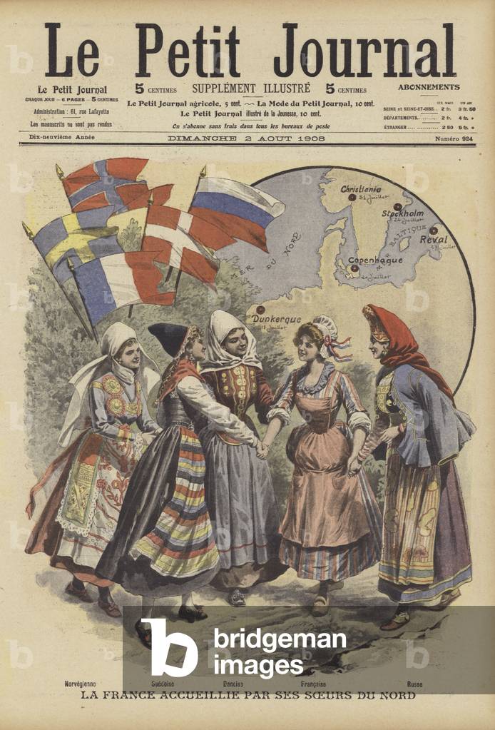 LLM2779423 France welcomed by her northern sisters. La France accueillie par ses soeurs du Nord. Norvegienne. Suedoise. Danoise. Francaise. Russe. Illustration for Le Petit Journal, 2 August 1908.