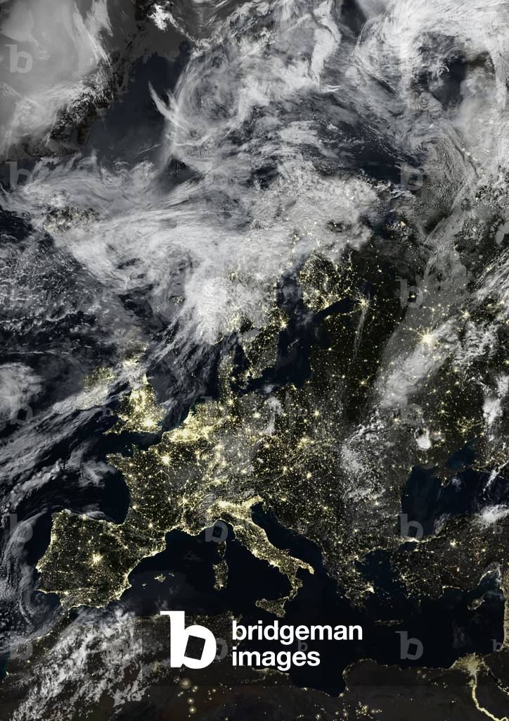 UIG520931 True colour satellite image of Europe at night with cloud coverage. This image in Lambert Conformal Conic projection was compiled from data acquired by LANDSAT 5 & 7 satellites.