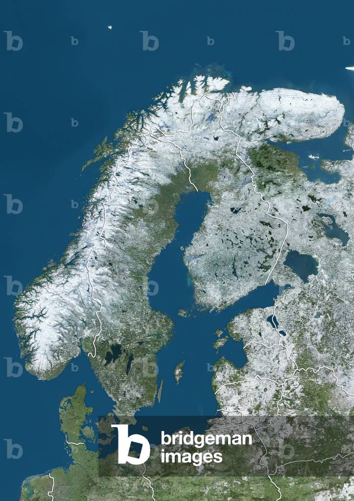 UIG3275092 Satellite view of Northern Europe showing Scandinavia and the Baltic States in winter, with partial snow cover (with country boundaries). This image was compiled from data acquired by Landsat 7 & 8 satellites.