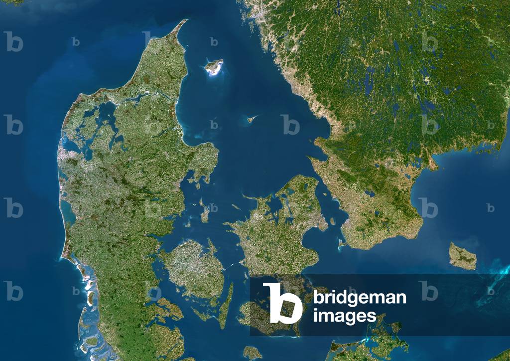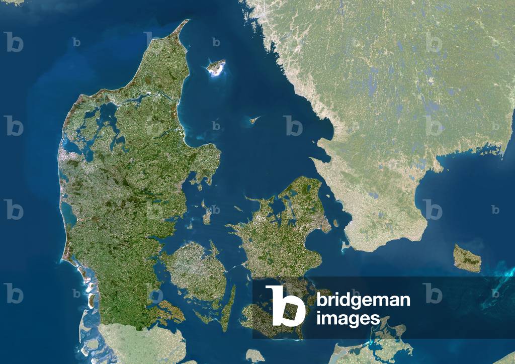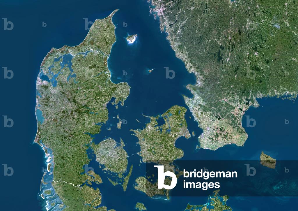 UIG601644 Denmark, true colour satellite image. Denmark comprises the peninsula of Jutland (down centre) and the islands of Funen (centre) and Zealand (centre right), along with many smaller islands. North of these islands and east of Jutland is the Kattegat sea, which separates Denmark from Sweden (upper right). Jutland borders Germany to the south, while the southernmost tip of Norway is at top left. The Baltic Sea is at right, the North Sea is at left. The image used data from LANDSAT 5 & 7 satellites.