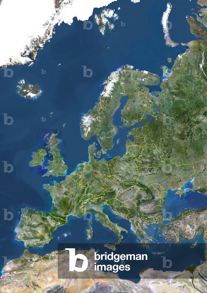 UIG520924 True colour satellite image of Europe with country borders. This image in Lambert Conformal Conic projection was compiled from data acquired by LANDSAT 5 & 7 satellites.