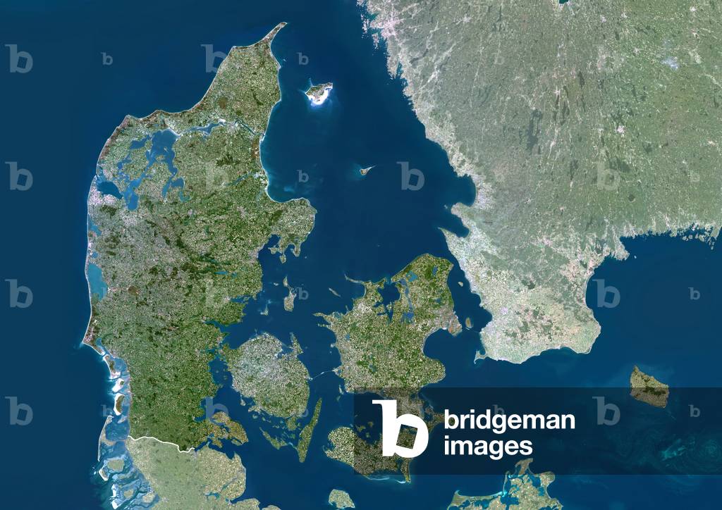 UIG601645 Denmark, true colour satellite image with mask. Denmark comprises the peninsula of Jutland (down centre) and the islands of Funen (centre) and Zealand (centre right), along with many smaller islands. North of these islands and east of Jutland is the Kattegat sea, which separates Denmark from Sweden (upper right). Jutland borders Germany to the south, while the southernmost tip of Norway is at top left. The Baltic Sea is at right, the North Sea is at left. The image used data from LANDSAT 5 & 7 satellites.