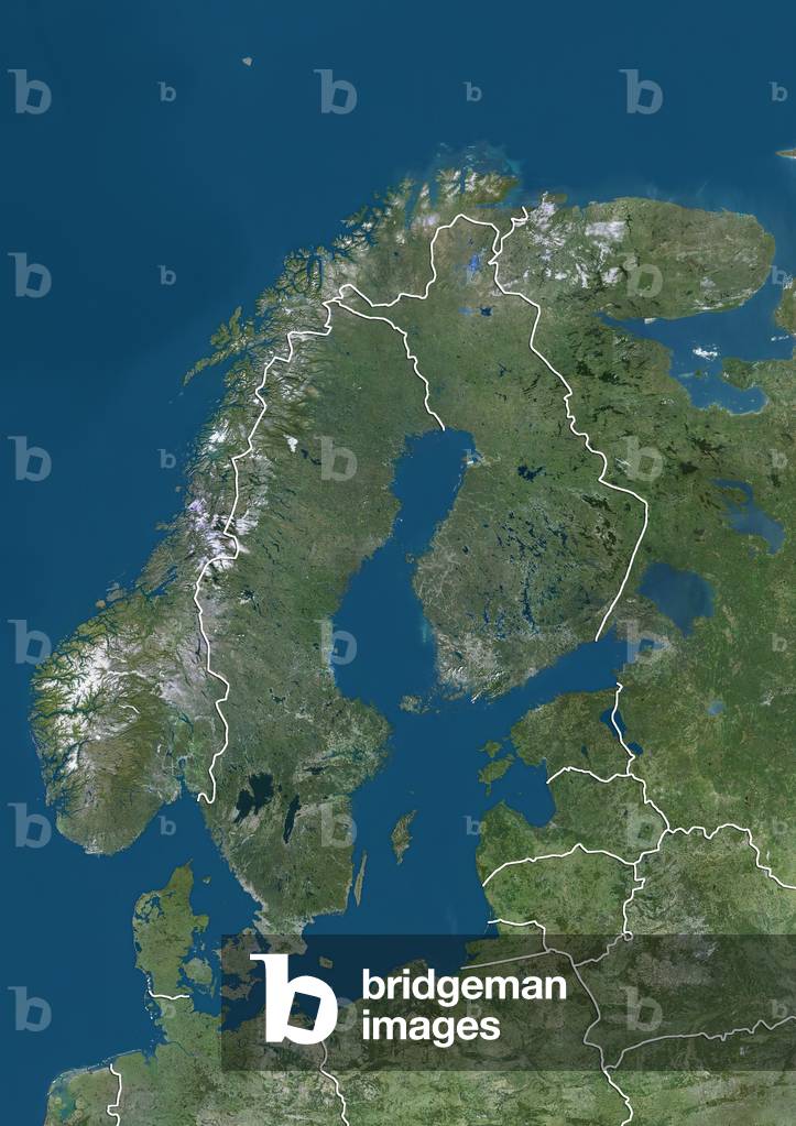 UIG3275095 Satellite view of Northern Europe showing Scandinavia and the Baltic States (with country boundaries). This image was compiled from data acquired by Landsat 7 & 8 satellites.