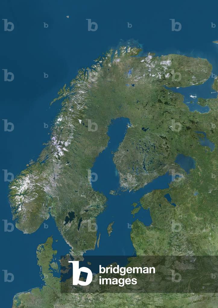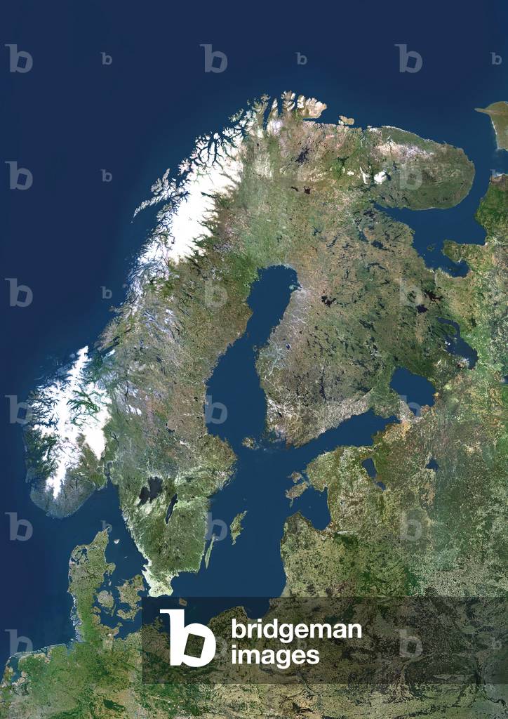 UIG601646 Scandinavia, true colour satellite image. The region comprises the countries of Norway (west coast of the peninsula at upper left), Sweden (on its east coast) and Denmark (small peninsula and islands west of southern Sweden). However, the term is often used to include Finland, across the Gulf of Bothnia to the east of Sweden. The Baltic Sea is at centre, with the thin Gulf of Finland (centre right) separating southern Finland from Estonia. Below Estonia on the east coast of the Baltic are Latvia and Lithuania. The south coast of the Baltic Sea is dominated by Poland (lower centre) and Germany (lower left). The image used data from LANDSAT 5 & 7 satellites.