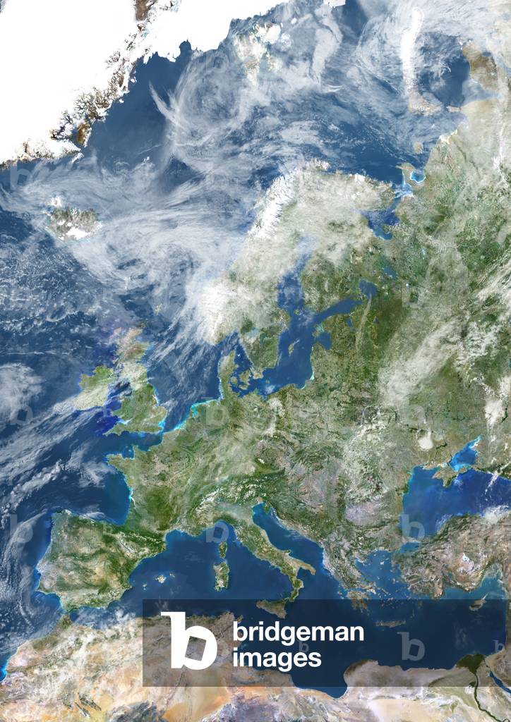 UIG520927 True colour satellite image of Europe with cloud coverage. This image in Lambert Conformal Conic projection was compiled from data acquired by LANDSAT 5 & 7 satellites.