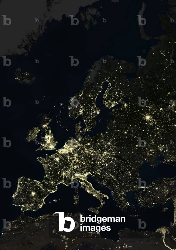 UIG520928 True colour satellite image of Europe at night. This image in Lambert Conformal Conic projection was compiled from data acquired by LANDSAT 5 & 7 satellites.