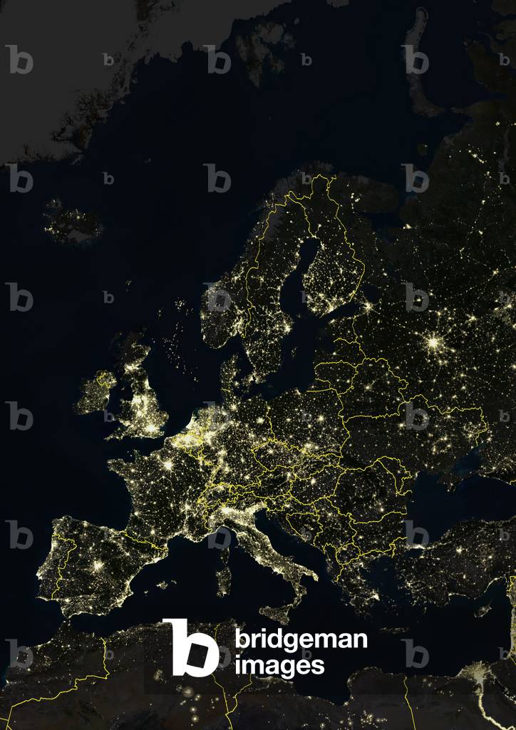 UIG520929 True colour satellite image of Europe at night with country borders. This image in Lambert Conformal Conic projection was compiled from data acquired by LANDSAT 5 & 7 satellites.