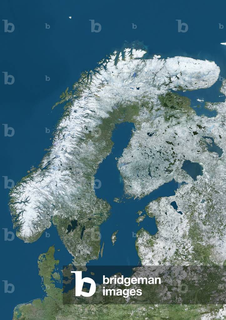 UIG3275089 Satellite view of Northern Europe showing Scandinavia and the Baltic States in winter, with partial snow cover. This image was compiled from data acquired by Landsat 7 & 8 satellites.