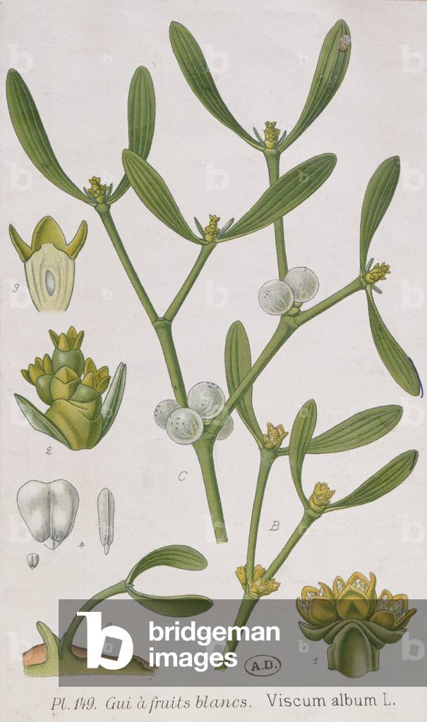 FLO4600440 Gui - Mistletoe, Viscum album, hemi-parasitic shrub. Handcoloured zincograph by C. Chabot drawn by Miss M. A. Burnett from her ""Plantae Utiliores: or Illustrations of Useful Plants,"" Whittaker, London, 1842. Miss Burnett drew the botanical illustrations, but the text was chiefly by her late brother, British botanist Gilbert Thomas Burnett (1800-1835).