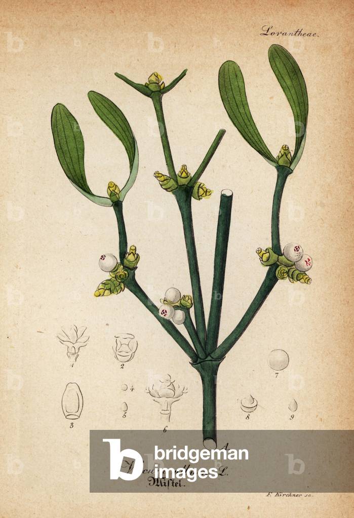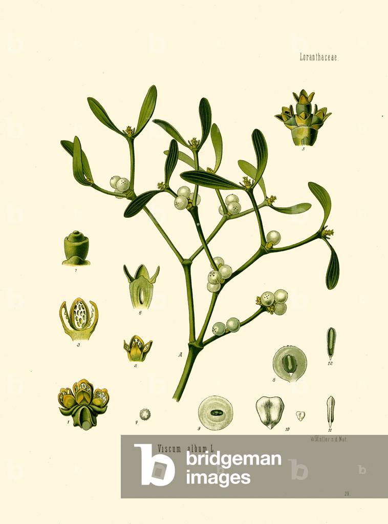 FLO4990690 Mistletoe, Viscum album. Chromolithograph after a botanical illustration by Walther Muller from Hermann Adolph Koehler's Medicinal Plants, edited by Gustav Pabst, Koehler, Germany, 1887.