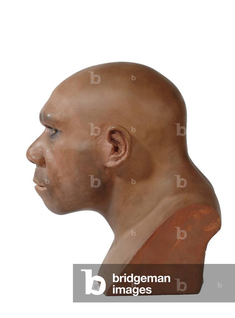 NHM1456349 Homo neanderthalensis, neanderthal man, A model head of Homo neanderthalensis (Neanderthal man), created by Maurice Wilson. Neanderthal man is believed to have lived between 130,000 to 35,000 years ago. - AncestorLondon UK