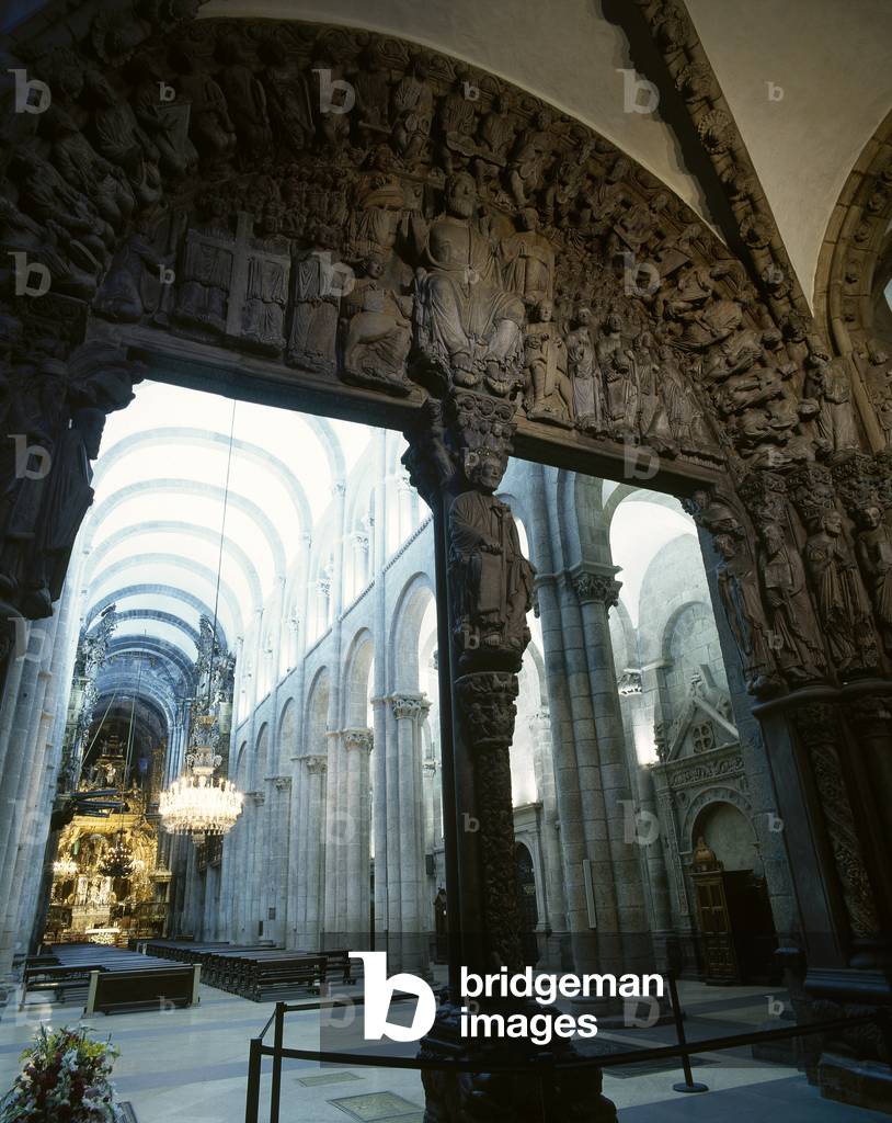 Romanesque architecture. Cathedral of Santiago de Compostela. Initiated around 1075, by order of the Bishop Diego Pelaez, by the Master Esteban. Most of the work was completed in 1122. In successive centuries new works were carried out. View of the central nave from the Portico of the Glory (Portico de la Gloria). Santiago de Compostela, province of A Coruña, Galicia, Spain.