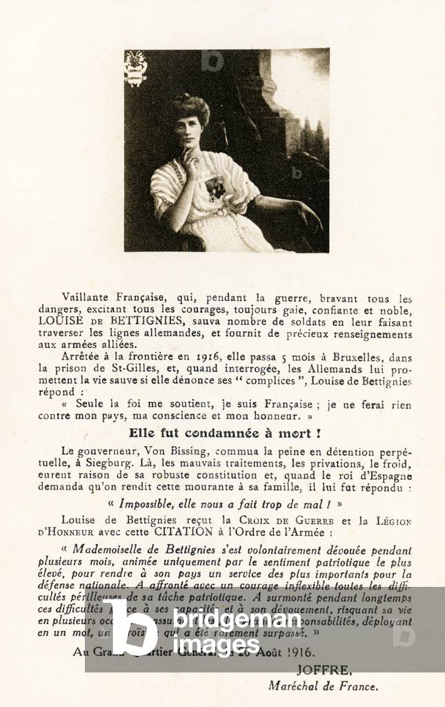 KDC498772 Louise de Bettignies (1880-1918) French secret agent (using the pseudonym of Alice Dubois) based in Lille with her assistant, Leonie Vanhoutte; gave significant help to the British army by collecting information from some 80 agents on German troop movements, artillery batteries and munition depots; arrested by the Germans in 1916 and condemned to death; following the international outcry the previous year over the shooting of Edith Cavell, she was reprieved from execution but died of ill health and privation in prison in 1918 at Siegburg; her bravery and heroism were noted by Marshal Joffre in 1916 when he gave the citation for her award of the Croix de Guerre and the Légion d'Honneur, describing her conduct as 'déployant en un mot, un héroisme qui a été rarement surpassé'( displaying, in one word, a rarely surpassed heroism'); the success of her intelligence network is thought to have helped save the lives of over a 1000 British soldiers and led to her being described as the 'Queen of Spies'';