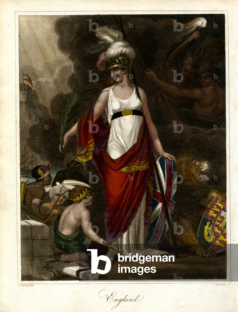 PRX11865543 This patriotic illustration depicts an allegorical figure of Britannia or England as a classical female figure wearing a helmet and red cloak. She carries a trident and leans on a shield bearing the Royal Coat of Arms. At her feet are a British lion and representatives of British colonies;including a kneeling Asian figure and an African figure. In the background;ships and soldiers are suggested;referring to the maritime and military power of the British Empire. From Encyclopaedia Londinensis;or Universal Dictionary of Arts;Sciences and Literature. Comprehending;under one general alphabetical arrangement;all the words and substance of every kind of dictionary extant in the English language. Compiled;digested and arranged by John Wilkes. London;1810.