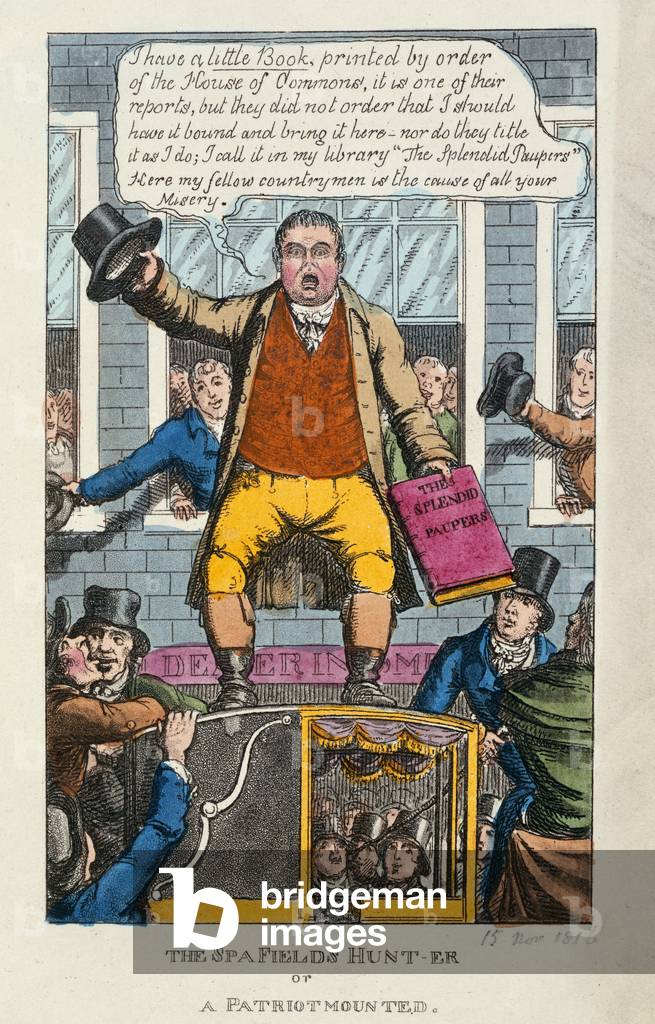 XCF290986 Henry Hunt (1773-1835); mass meeting to call for political reform in Spa Fields, London; Hunt holds a copy of the Extraordinary Red Book, inscribed The Splendid Paupers;