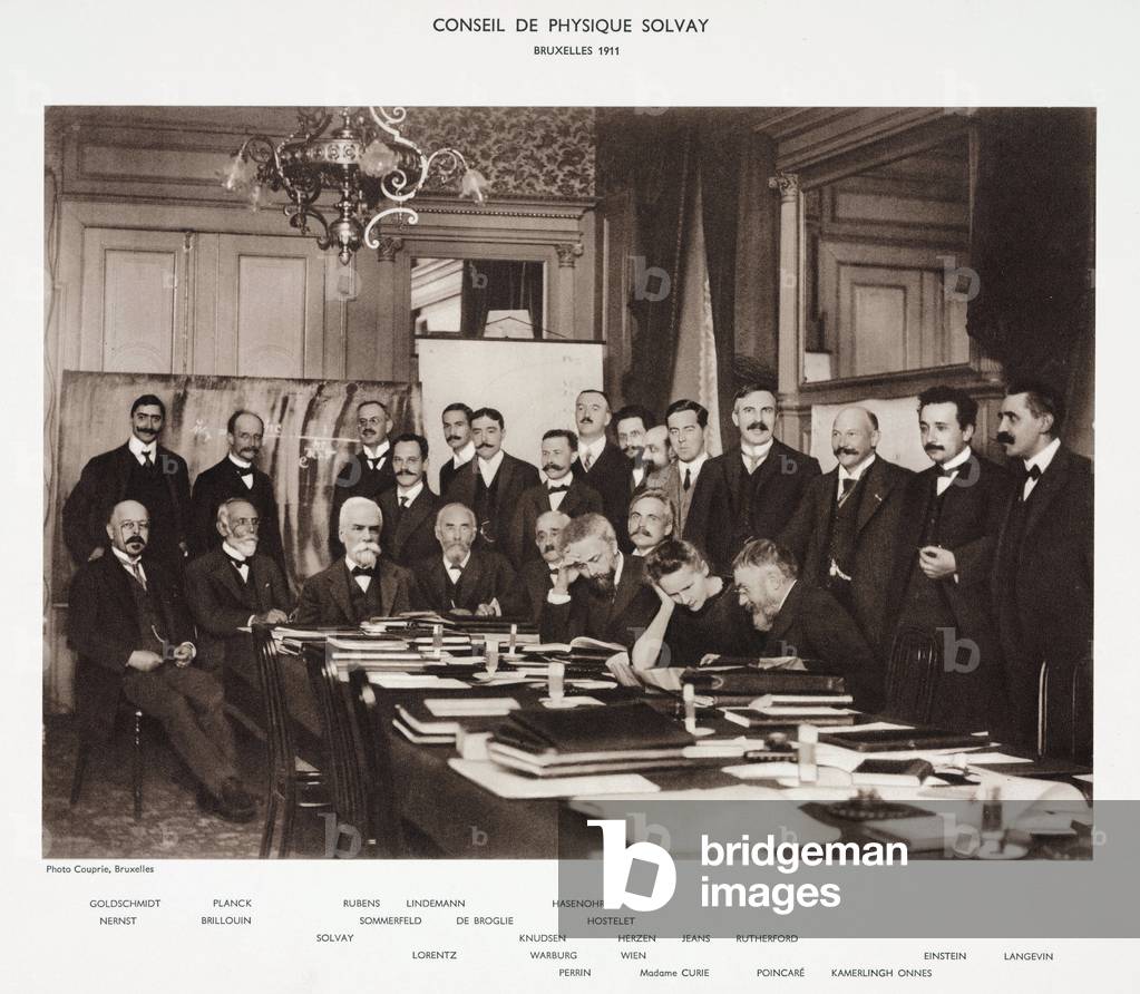 UIS5077528 The Solvay Physics Conferences which were initiated by Belgian chemist and industrialist Ernest Solvay (1838-1922). The 1911 conference discussed current questions of molecular and kinetic theory. Those present included Marie Curie (1867-1934), Ernest Rutherford (1871-1937), Albert Einstein (1879-1955), Max Planck (1858-1947) and Paul Langevin (1872-1946).