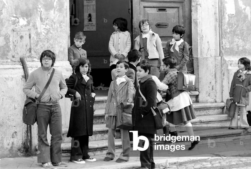 MPX5118886 Young children on the steps of their school building in a poor suburb on the outskirts of Rome, Italy, April 1975
