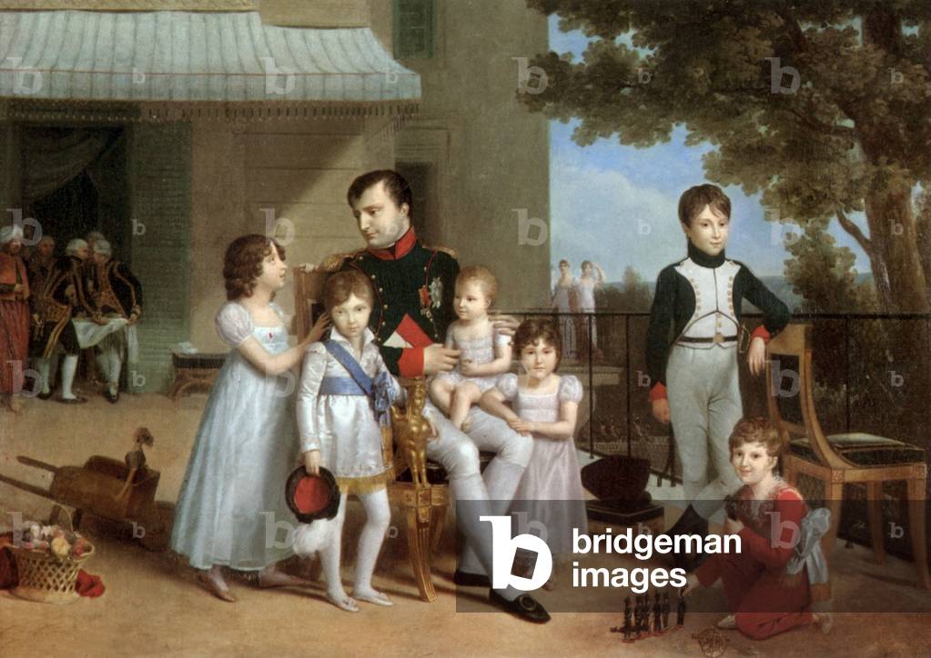 PVD1689590 French emperor Napoleon 1st in Saint-Cloud with his nephews and nieces c. 1809 : 2 daughters and 2 sons of Joachim Murat and Caroline Bonaparte (on r : Achille, Laetizia, Lucien, Louise) with 2 sons of Louis Bonaparte and Hortense de Beauharnais (Napoleon Louis and on kneel Charles Louis Napoleon future Napoleon III), paintintg by Ducis