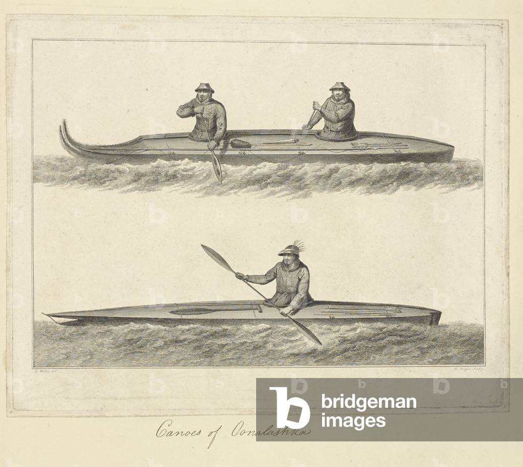 BL3294477 Ships with towering ice-covered cliffs on either side. Two large canoes crowded with natives are approaching the two ships from the left. At right a kayak holding two, and in the distance, closer to the ships, others, with single oarsmen. Captain Cook's third voyage., 1776-1780.Illustrator: Webber, John 1768-1780 Source/Shelfmark: Add.23921 f.88 Drawn by John Webber and engraved by William Ellis.