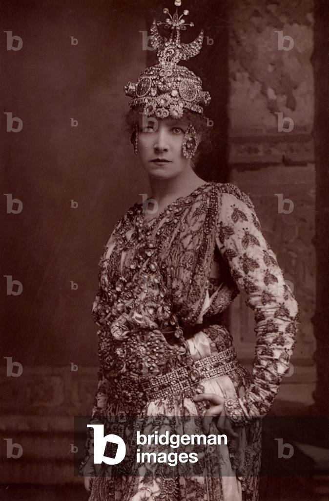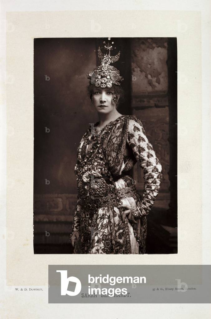 UIS5079343 Sarah Bernhardt', 1890. A photographic portrait of French theatre and film actress Sarah Bernhardt (1844-1923), taken by W & D Downey. Bernhardt, dressed in elaborate costume, stands with left hand on her hip, a backdrop of theatre scenery behind her. The most celebrated actress of her day, Victor Hugo said she had a 'golden voice'. In addition to acting, she wrote her autobiography and founded the Sarah Bernhardt Theatre in Paris. Her image was used widely in advertising. This photograph appears in 'The Cabinet Portrait Gallery' series of celebrity portraits and biographies published in the 1890s. The series includes royalty, actors, academics and authors. ©SSPL/NMeM/Kodak Collection