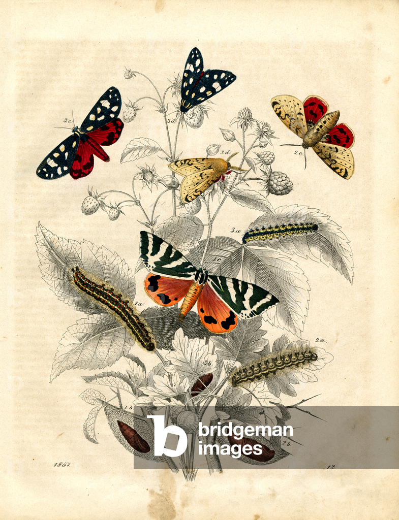 The illustration shows various European butterfly species with their developmental stages on raspberry plants (Rubus idaeus). Featured are the Meadow Brown (Maniola jurtina), the Small Tortoiseshell (Aglais urticae), and the White Ermine moth (Spilosoma lubricipeda) with their characteristic color patterns. The image depicts caterpillars, pupae, and adult butterflies, illustrating the complete metamorphosis process of these insects, which serve as important pollinators in Central European ecosystems.. From Das Buch der Welt, ein Inbegriff des Wissenswürdigsten und Unterhaltendsten aus den Gebieten der Naturgeschichte, Naturlehre, Länder- und Völkerkunde, Weltgeschichte, Götterlehre etc. Mit vielen colorirten und schwarzen Abbildungen. Published by Julius Hoffmann, Hoffmannsche Verlags-Buchhandlung, Stuttgart, 1842 - 1868.. [butterflies, Lepidoptera, Meadow Brown, Maniola jurtina, Small Tortoiseshell, Aglais urticae, White Ermine moth, Spilosoma lubricipeda, metamorphosis, caterpillar, pupa, imago, raspberry, Rubus idaeus, pollinators, insects, entomology, natural history, zoology, hand-coloured copper engraving]