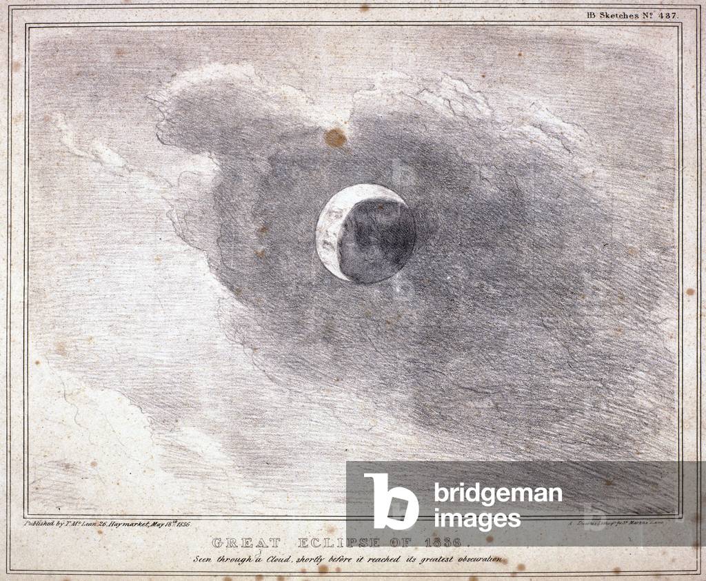 UIS5084374 Great Eclipse of 1836', 1836. Print showing the partly obscured Sun during the annular solar eclipse of 1836. The lithograph titled 'Great Eclipse of 1836' was published in London by T McLean. The eclipse was not total, but rather annular so that a thin ring of the Sun's disc was seen at mid eclipse. Visible from central Scotland and Northern England the eclipse was viewed by Mr Francis Baily who saw beads of light appear just before and after the maximum stage of the eclipse. Known today as 'Baily's Beads' they are caused by sunlight shining through lunar valleys. Artistic licence has been used in this sketch as faces have been drawn on both the disc of the Sun and Moon. ©SSPL/Science Museum