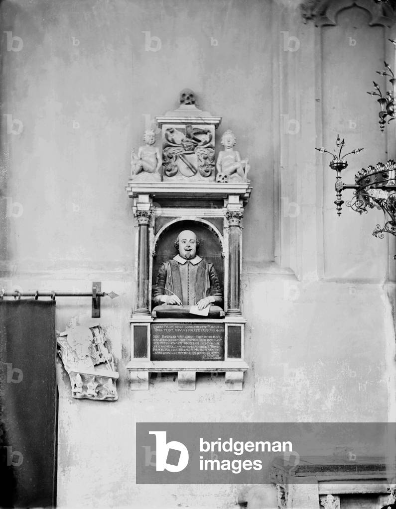 EHT3613452 Shakespeare Monument, Holy Trinity Church, Stratford-upon-Avon, Warwickshire. The monument, erected by Gerard Johnson, is a frontal bust of the bard, who died in 1616, with an inscription below. Photographed by Henry Taunt, 1870s.