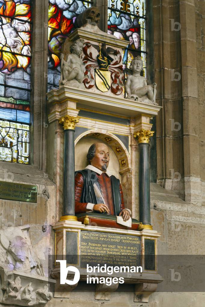 KW6343692 Stratford-upon-Avon, Warwickshire, England. Funerary monument of playwright William Shakespeare in Holy Trinity Church.