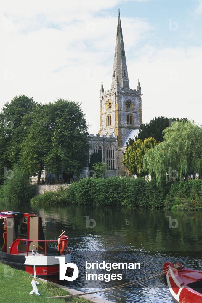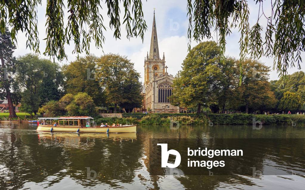 KW6343703 Stratford-upon-Avon, Warwickshire, England. Pleasure cruise along the River Avon. Holy Trinity Church, where Shakespeare is buried, in background.