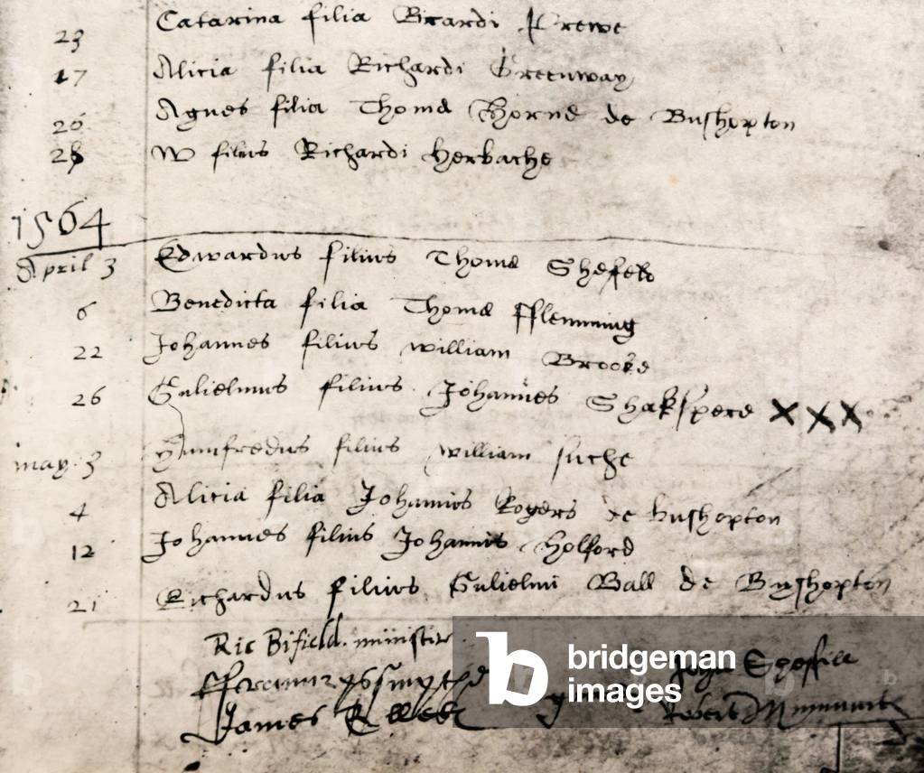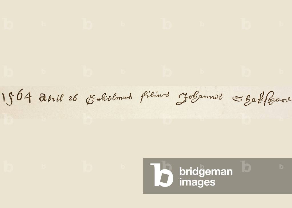 KWE428464 '1564 April 26 Guiliamus filius Johannes Shakspere', or 'William son of John Shakspere', baptised at the Holy Trinity Church in Stratford-upon-Avon, from the Illustrated Library Shakespeare published 1890;