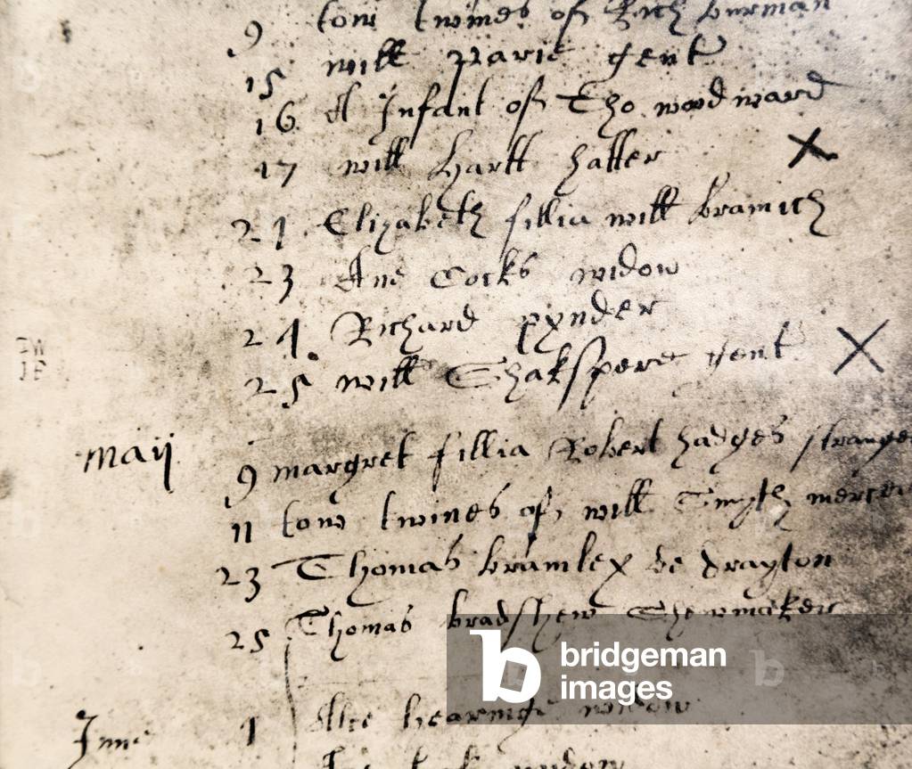 KWE1547344 Facsimile register entry for burial of William Shakespeare on April 25, 1616 displayed in Holy Trinity Church, Stratford-upon-Avon. The original Parish registry is now held by the Birthplace Trust.
