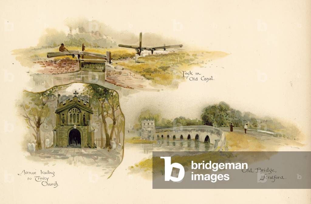 LLM961133 Three views of Shakespeare's Stratford-upon-Avon: lock in old canal; avenue leading to Holy Trinity Church; and old bridge, Statford. Published in Shakespeare and his Birthplace, by Emma Marshall; published by Ernest Nister, 24 St Bride Street, London, and E P Dutton & Co, 31 West Twenty-third Street, New York. Printed by Ernest Nister at Nuremberg, Bavaria.