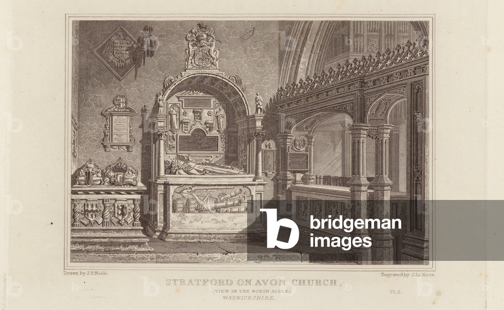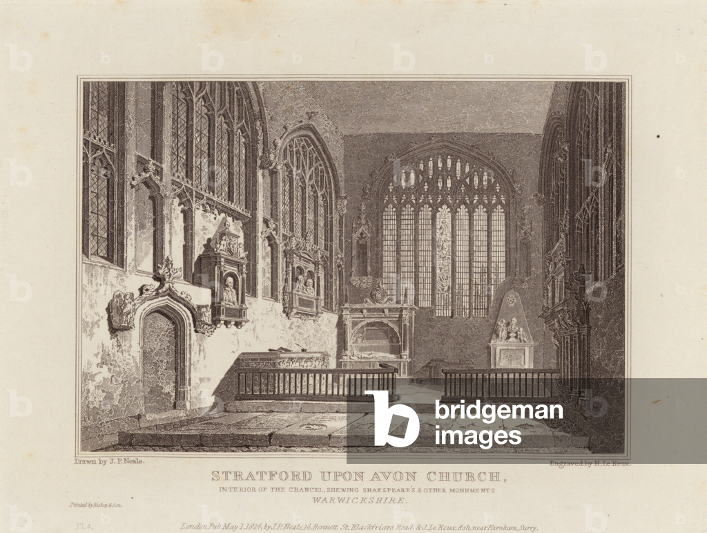 LLM11714118 Stratford Upon Avon Church, Interior of the Chancel, Shewing Shakspeare's & Other Monuments, Warwickshire. Illustration for Views of the most interesting Collegiate and Parochial Churches in Great Britain by John Preston Neale and John Le Keux (Longman et al, 1824/25).By John Preston Neale
