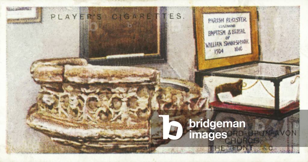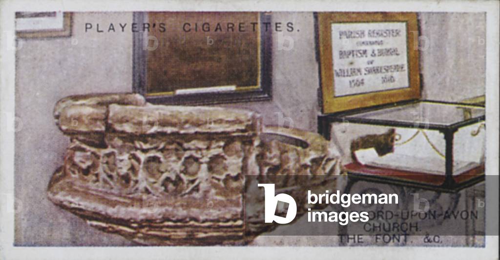 LLM8668785 Stratford-upon-Avon Church, The Font, etc. Illustration for one of a set of 25 cigarette cards, the Shakespearian Series, issued by John Player & Sons in 1917.