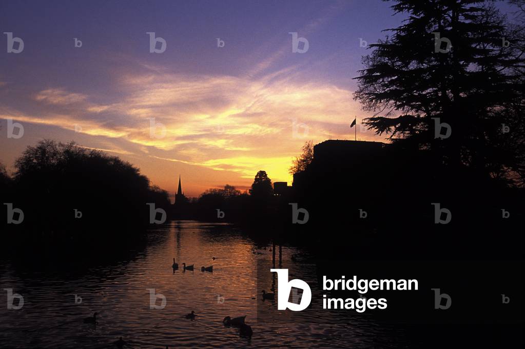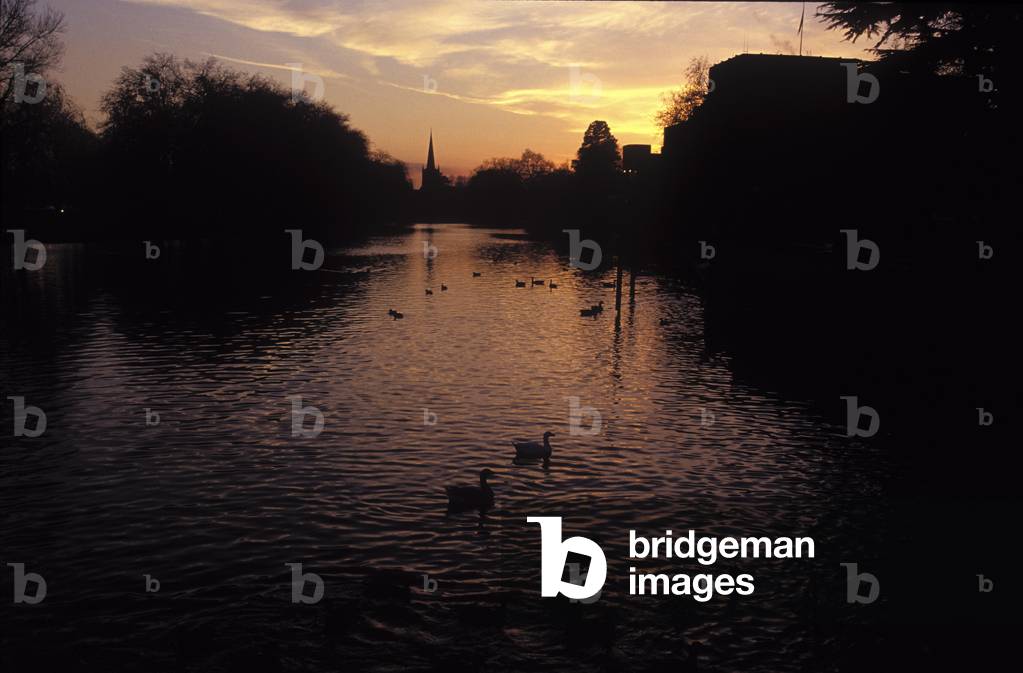 SLR3832628 River Avon - view along the river at sunset, with silhouettes of the Royal Shakespeare Theatre on the left and a church in the distance, Stratford-upon-Avon, England.