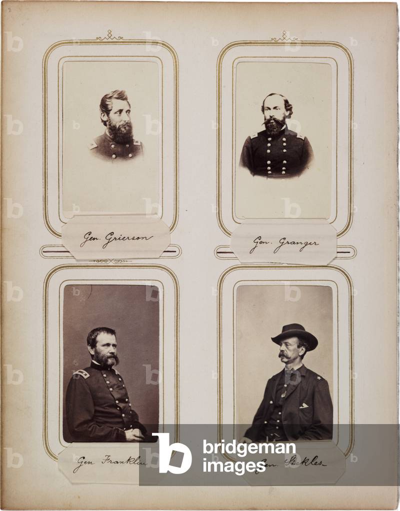 GLC696166 Album with ”A.A.” initials embossed on front knob. Includes images of Lincoln, Mary Lincoln (2), Lincoln’s Cabinet, generals, writers, freed slaves, prisoners of war, Confederate leaders, etc. Lacks one clasp. Due to album’s fragility, pages removed from album 6/97 and boxed as album pages. 50 pages with four cartes per page, most labelled in a contemporary hand (and sometimes humorously, as in Jefferson Davis).