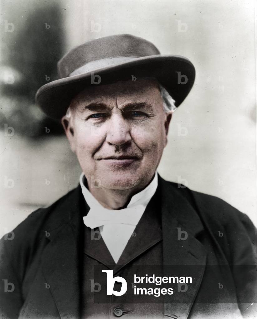 HIM5297213 'Thomas Edison.', c1920.Thomas Edison (1847-1931), was dubbed The Wizard of Menlo Park by a newspaper reporter, he was one of the first inventors to apply the principles of mass production to the process of invention, and therefore is often credited with the creation of the first industrial research laboratory. Edison is considered one of the most prolific inventors in history, holding 1093 US patents in his name, as well as many patents in the United Kingdom, France and Germany. (Colorised black and white print)