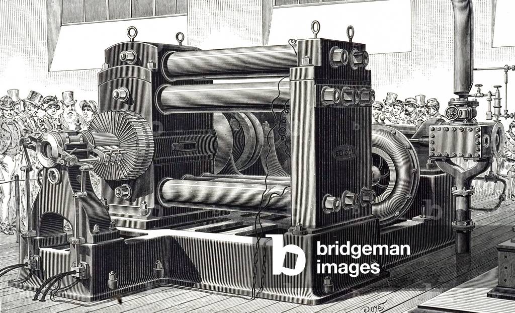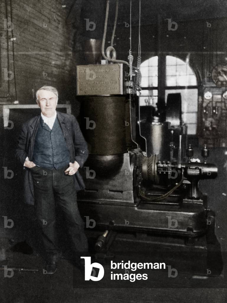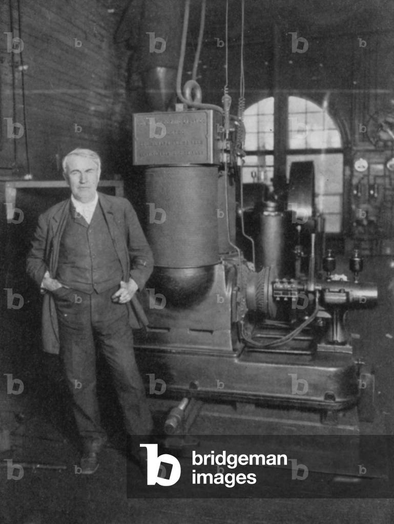 HIM5294340 HIP2651090Thomas Alva Edison, American inventor, with his first dynamo for producing electric light, 1880s. Edison (1847-1931) was a prolific inventor who registered over 1000 patents, many of which were related to the development of electricity. His inventions, in collaboration with his staff, include the automatic telegraph, the electric lamp, the phonograph (gramophone) and the kinetoscope, an early form of cinematography. In 1882 the Edison General Electric Company opened New York's first electric power station which operated on the DC (direct current) system.